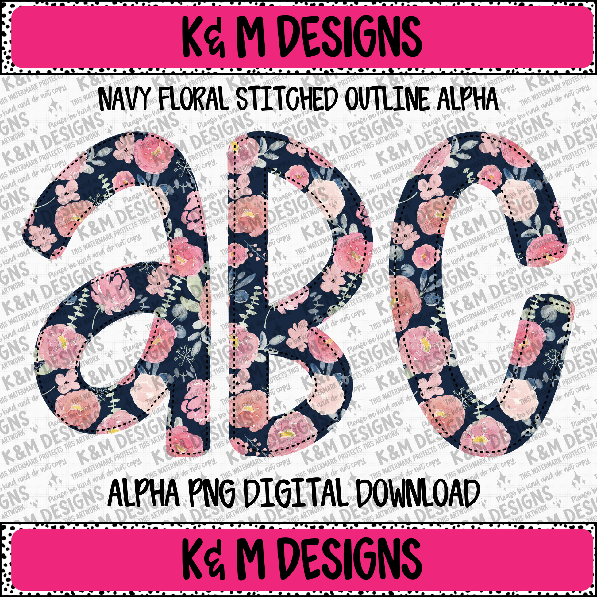 Navy Floral Stitched Outline Alpha PNG Set Digital Download